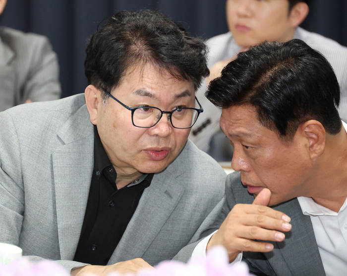 이한주 국정기획위원회 위원장(왼쪽)이 국정기획위원회에서 열린 정치행정분과 검찰청 업무보고에서 조승래 국정기획위원회 대변인과 대화하고 있다. [사진 = 연합뉴스] |