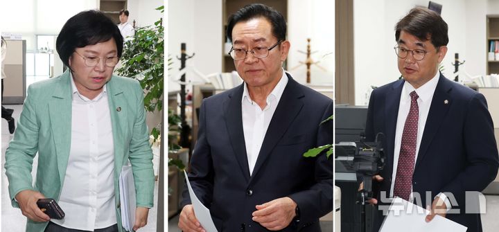 [서울=뉴시스] 조성봉 기자= 김민석 국무총리 후보자 인사청문특별위원회 위원장인 이종배 국민의힘 의원을 비롯한 여야 간사가 17일 오후 서울 여의도 국회 의원회관에서 회의를 마치고 밖으로 나서고 있다. 여야는 오는 24, 25일 이틀 간 인사청문회를 진행하기로 합의했다. 왼쪽 사진부터 김현 더불어민주당 간사, 이 위원장, 배준영 국민의힘 간사. 2025.06.17. suncho21@newsis.com |