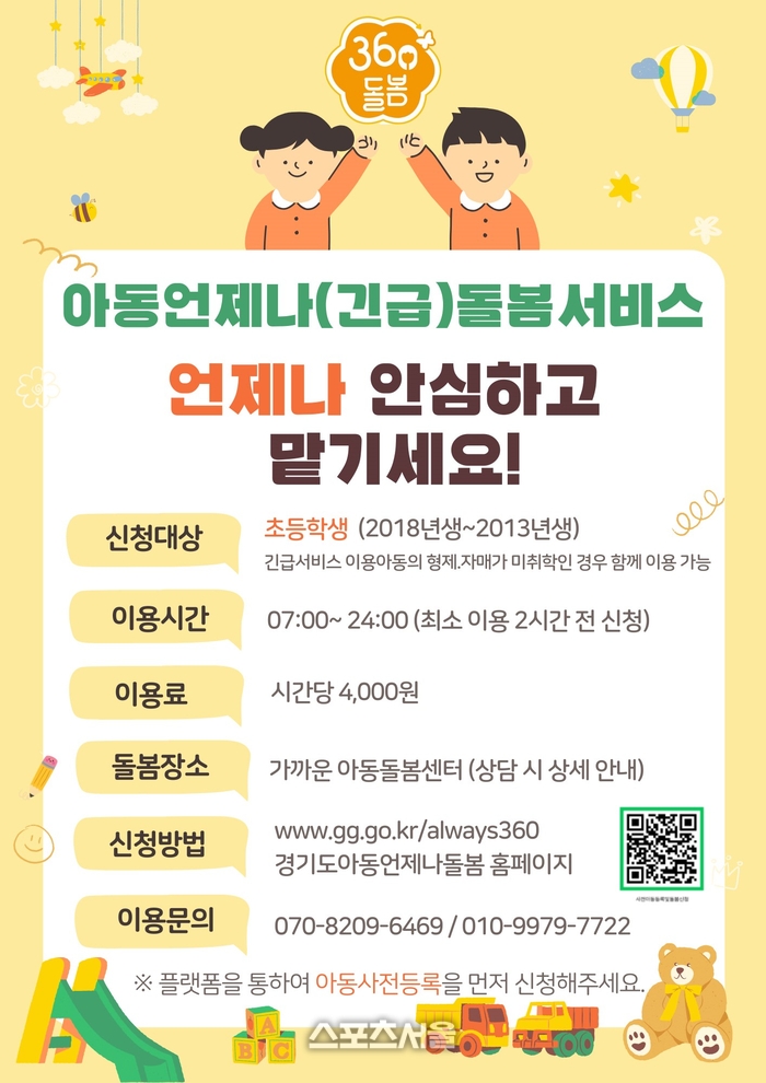 21일 시에 따르면 평일은 물론 주말과 휴일, 야간까지 돌봄 공백을 채우는 ‘아동 언제나 돌봄 서비스’를 운영 중이다. 오전 7시부터 밤 12시까지 운영되며, 주중·주말 구분 없이 연중무휴 신청이 가능하다.