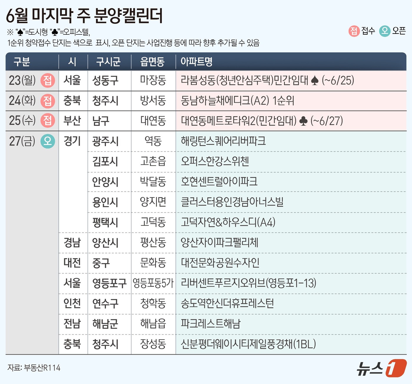 21일 부동산R114에 따르면 6월 마지막 주에는 전국 3개 단지 총 390가구(일반분양 650가구)가 분양을 앞두고 있다. 충북 청주시 방서동 '동남하늘채에디크', 서울 성동구 마장동 '라봄성동'(청년안심주택, 민간임대) 등에서 청약을 진행한다.