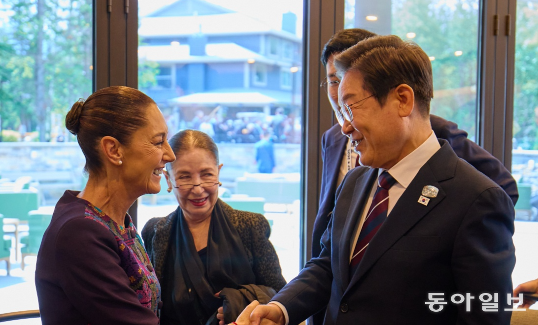 이재명 대통령과 클라우디아 셰인바움 멕시코 대통령(왼쪽)이 17일(현지시간) 캐나다 앨버타주 캐내내스키스 G7 정상회의장에서 열린 한·멕시코 정상회담에서 악수하고 있다. 송은석 기자 silverstone@donga.com |