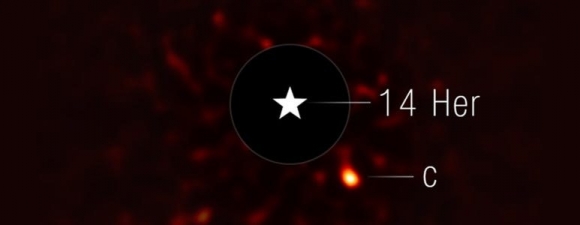 중앙의 14 허큘리스(14 Her로 표기)와 그 주변의 행성 14 허큘리스 c (C로 표기) . Webb Space Telescope 제공