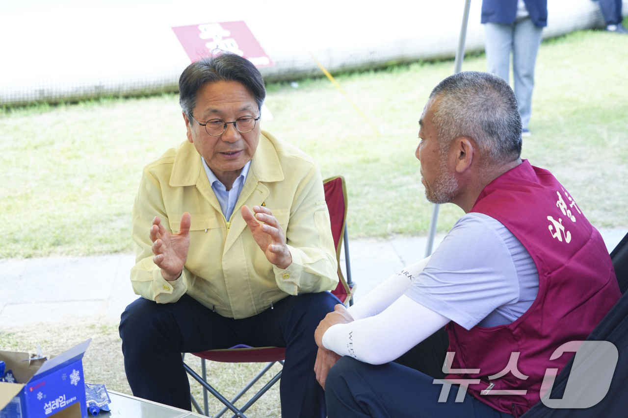 강기정 광주시장이 지난 12일 광주시청 앞 시내버스 노조 천막농성장에서 노조원들과 면담을 하고 있다.(광주시 제공. 재판매 및 DB 금지) 2025.6.21/뉴스1 |