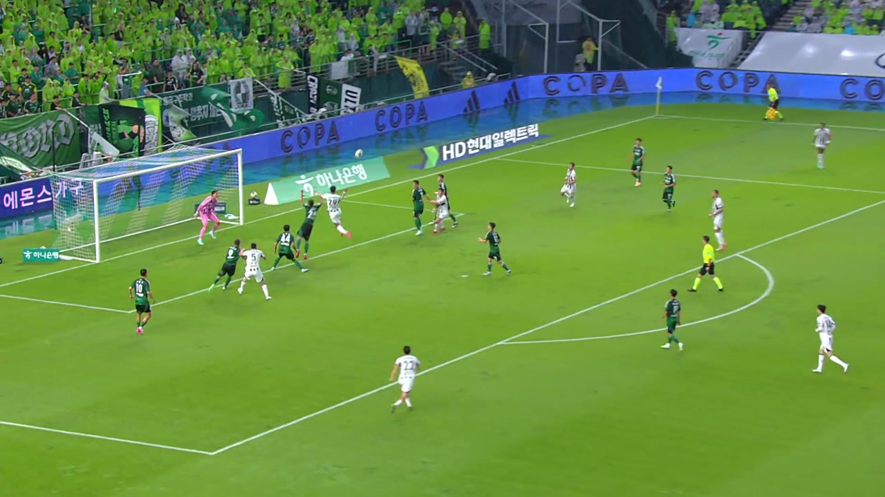 전북은 전반 24분 선취골을 내줬지만 추가 시간 송민규가 오른발 슛으로 동점 골을 터트렸습니다.