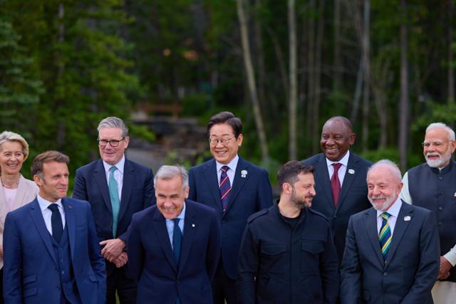 광화'문'과 삼각'지'의 중구난'방' 뒷이야기. 딱딱한 외교안보 이슈의 문턱을 낮춰 풀어드립니다.이재명 대통령이 17일(현지시간) 캐나다 앨버타주 캐내내스키스 주요 7개국(G7) 정상회의장에서 G7 및 초청국 정상들과 기념촬영을 하고 있다. 대통령실 제공 |
