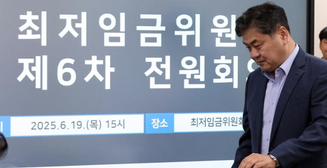 이인재 최저임금위원장이 19일 세종시 정부세종청사에서 열린 6차 전원회의에 참석하고 있다. 뉴시스 |