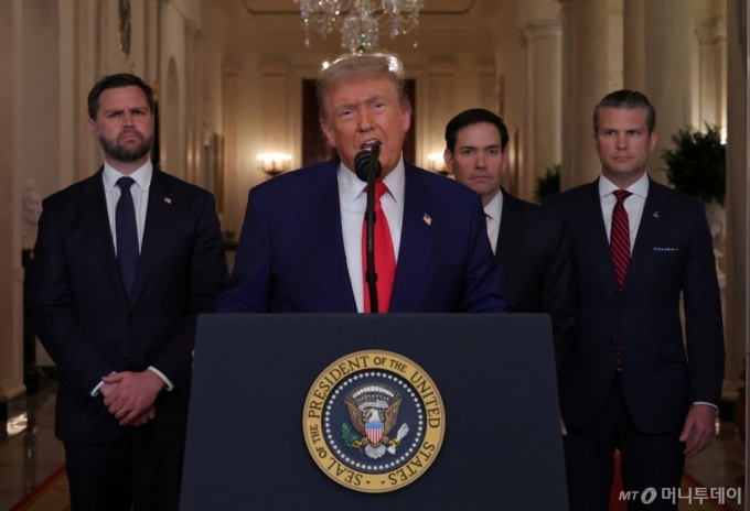 (로이터=뉴스1) 장수영 기자 = 도널드 트럼프 미국 대통령이 21일(현지시간) 미국 워싱턴 DC 백악관에서 이란 핵 시설 공격과 관련한 대국민 연설을 하고 있다. 2025.6.22 ⓒ 로이터=뉴스1 Copyright (C) 뉴스1. All rights reserved. 무단 전재 및 재배포, AI학습 이용 금지. /사진=(로이터=뉴스1) 장수영 기자 |
