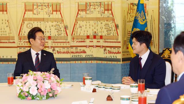 이재명 대통령이 22일 서울 한남동 관저에서 열린 여야 지도부와의 오찬에서 국민의힘 김용태 비상대책위원장과 대화하고 있다. [사진=연합뉴스] |