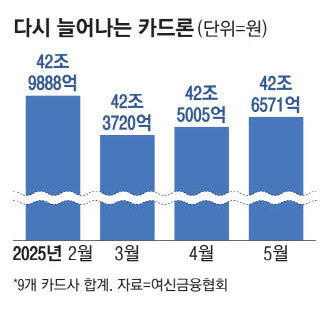 22일 여신금융협회에 따르면 지난 5월 9개 카드사(신한·삼성·현대·KB국민·롯데·하나·우리·BC·NH농협카드)의 카드론 잔액은 42조6571억원으로 전달 대비 1566억원 늘어났다. 지난 4월에 이어 두 달 연속 증가한 것이다.