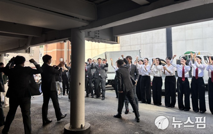 HDC현대산업개발 임직원들이 용산정비창 전면1구역 시공권을 따낸 후 기쁨을 만끽하고 있다. [서울=뉴스핌] 조수민 기자 = 2025.06.22 blue99@newspim.com |