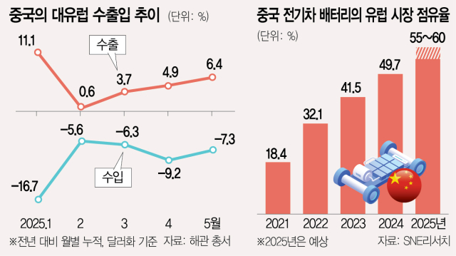 더구나 올해 들어서는 미국의 관세전쟁으로 인해 미국산 수출길이 막힌 중국 제품의 유럽행이 늘어나고 있다는 분석이 제기된다. 해관총서의 5월 데이터에 따르면 중국의 대미 수출은 전년 동기 대비 34.5% 줄었지만 EU 주요 국가인 프랑스·독일로의 수출은 24.1%, 21.5% 늘었다. 중국산 저가 공산품이 주로 수출된 탓이지만 정작 EU에서 반덤핑 조치를 취하지 않는 것은 중국산 제품으로 인한 물가 안정 효과도 무시할 수 없어서다. 올해 유로존(유로화 사용 국가)의 소비자물가 상승률은 매달 감소해 5월에는 1.9%에 그쳤다. 미국의 관세전쟁 영향으로 소비심리가 위축되고 에너지 가격 하락에 따른 영향이지만 중국산 제품이 물가 상승을 억제하는 데 도움을 주고 있다는 판단이다.