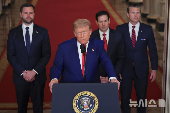 [워싱턴=AP/뉴시스] 도널드 트럼프 미국 대통령이 21일(현지 시간) 백악관 이스트룸에서 미군의 이란 핵 시설 공습에 관해 발언하고 있다. 트럼프 대통령은 "이란의 핵 프로그램에 대한 선제적 조치로, 정밀 타격이 성공적으로 이루어졌다"라고 밝혔다. 이 자리에는 JD 밴스 부통령, 마코 루비오 국무장관, 피트 헤그세스 국방장관이 배석했다. 2025.06.22. |