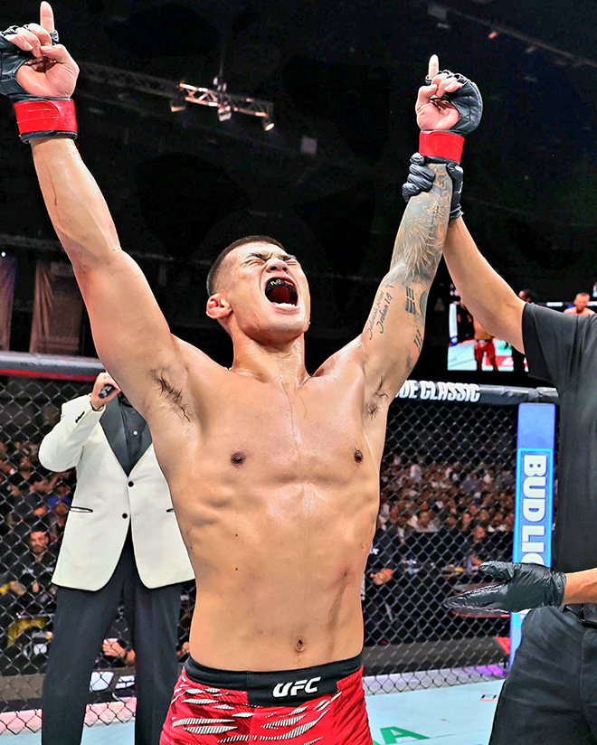 제41회 국제삼보연맹 세계선수권대회 컴뱃 부문 금메달리스트 고석현이 2025년 6월 아제르바이잔 바쿠 크리스털 홀 UFC on ABC 8 제6경기 승리 선언을 받고 있다. 사진=TKO |