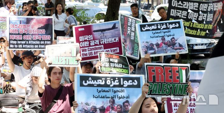 [서울=뉴시스] 추상철 기자 = 트럼프 미국 대통령이 이란의 주요 핵 시설을 파괴했다고 밝힌 22일 오후 서울 종로구 교보빌딩 인근에서 열린 노동자연대의 '전쟁 중단 및 이스라엘 공격 규탄집회'에서 이란인 등 집회 참가자가 피켓을 들고 전쟁 중단을 촉구하고 있다. 2025.06.22. scchoo@newsis.com |