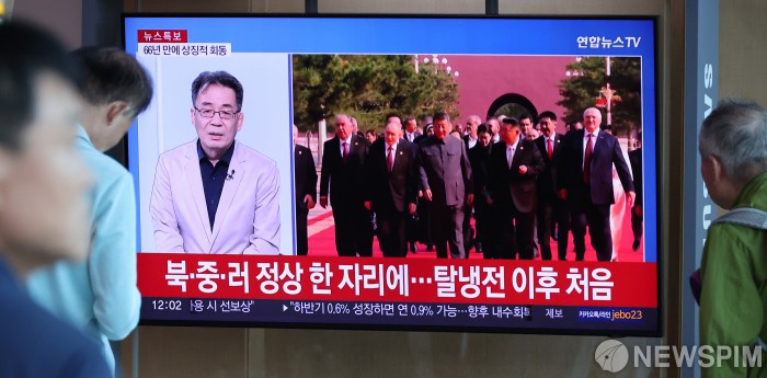 [서울=뉴스핌] 김학선 기자 = 3일 서울 중구 서울역에 설치된 TV에 중계되는 중국 전승절 열병식 행사에서 시진핑 중국 국가주석과 블라디미르 푸틴 러시아 대통령, 김정은 북한 국무위원장이 참석한 장면이 나오고 있다. 2025.09.03 yooksa@newspim.com |