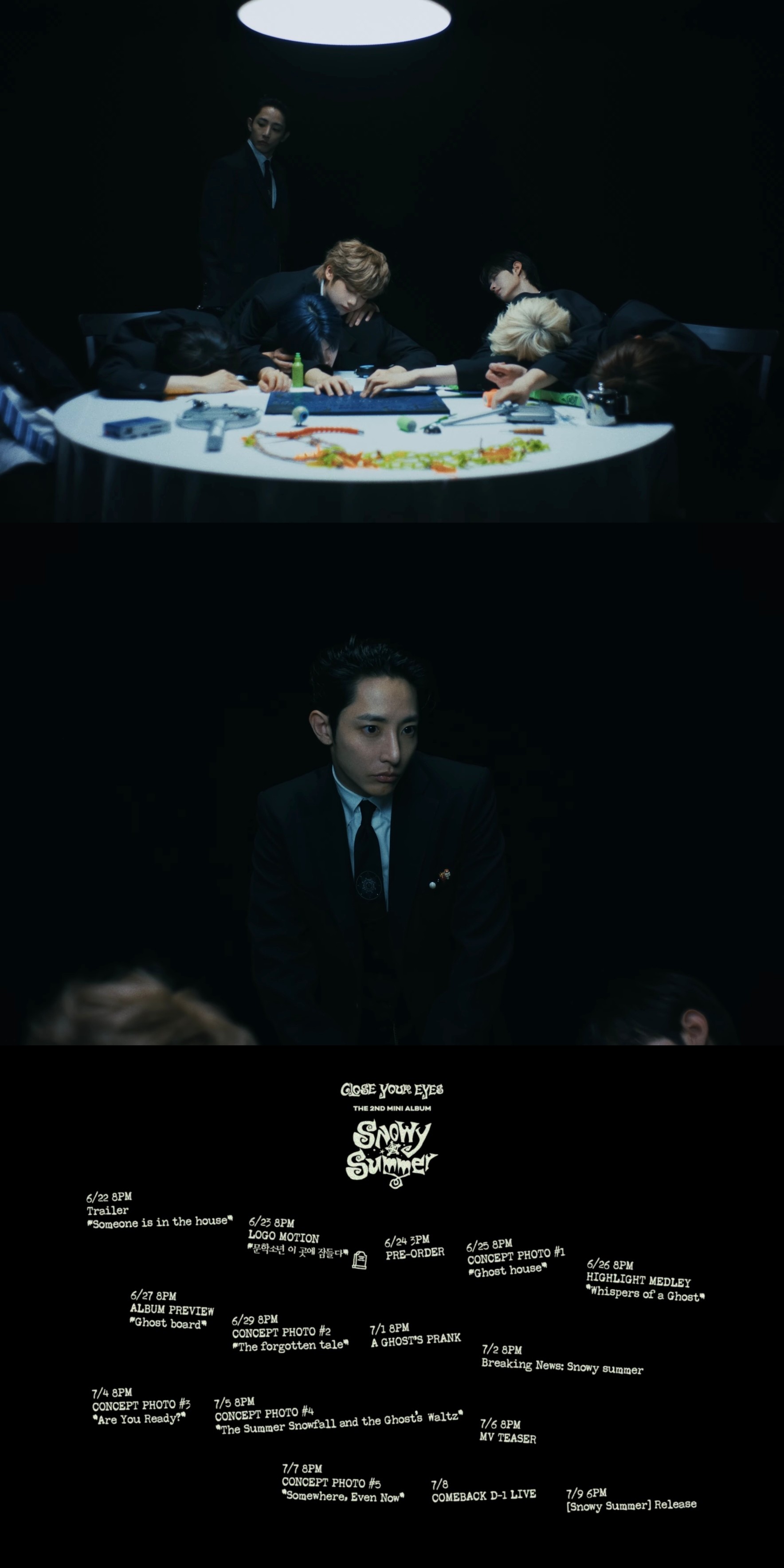 트레일러 영상에서는 클로즈 유어 아이즈가 블랙 슈트를 입고 등장했다. 어두운 공간 속, 테이블에 둘러앉았다. 공포스러운 얼굴로 변하며 놀라는 모습.