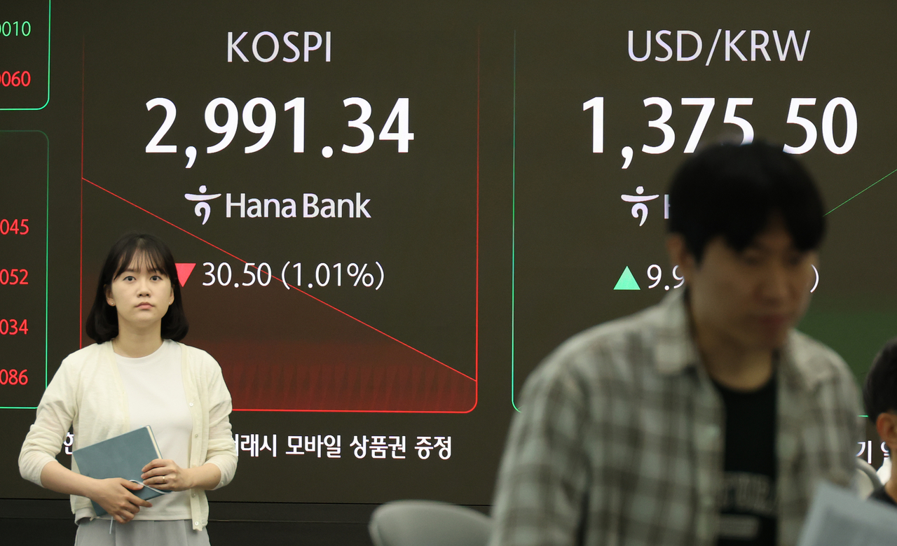 23일 오전 서울 하나은행 본점 딜링룸에 코스피 지수가 표시돼 있다. 이날 코스피는 미국의 이란 핵 시설 공격으로 중동 불안이 최고조로 치닫자 2,990대로 후퇴했다. [연합] |