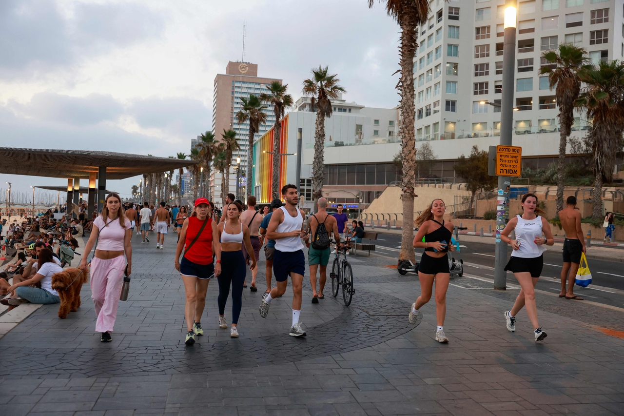 22일(현지시간) 이란과 이스라엘 무력 충돌이 10일째 이어지는 가운데, 시민들이 이스라엘 텔아비브 해변 산책로를 따라 조깅을 하고 있다. [AFP] |