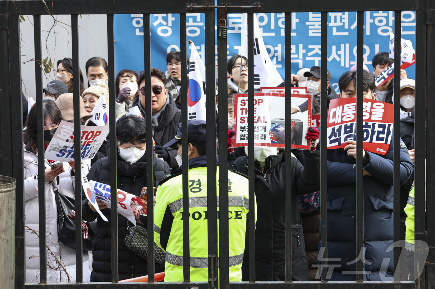 내란 우두머리 혐의로 체포된 윤석열 대통령의 구속 전 피의자 심문(영장실질심사)이 열린 18일 서울 마포구 서울서부지방법원 앞에서 윤 대통령 지지자들이 집회를 이어가고 있다.(공동취재) 2025.1.18/뉴스1 ⓒ News1 민경석 기자 |