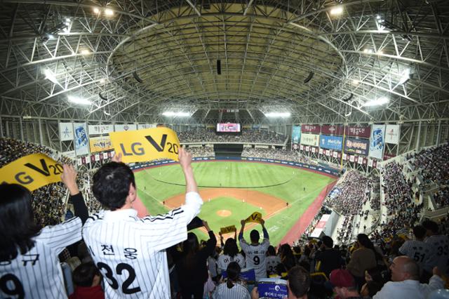 야구팬들이 서울 구로구 고척스카이돔에서 프로야구 경기를 관람하고 있다. 한국일보 자료사진 |