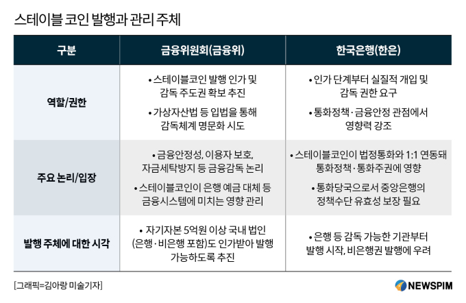 스테이블코인 발행의 권한이 금융위원회에 주어지면 금융권 뿐 아니라 핀테크 업체 등 민간 참여 확대 가능성이 커진다. 반면, 한국은행의 권한이 강해지면 발행 주체가 금융권으로 한정될 수 있다.