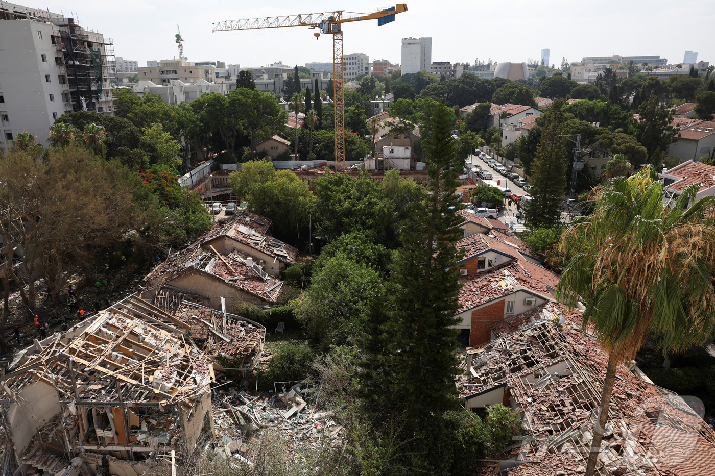 (텔아비브 로이터=뉴스1) 강민경 기자 = 22일 이란에서 발사된 미사일로 파괴된 이스라엘 텔아비브의 한 주택가. 2025.6.22 ⓒ 로이터=뉴스1