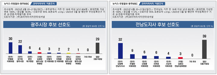 [광주=뉴시스] 제9회 전국동시지방선거 광주시장, 전남지사 후보 선호도. (그래픽=최희영) photo@newsis.com *재판매 및 DB 금지 |