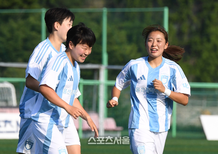 울산과학대 고은빈(가운데)이 23일 경남 합천에서 열린 ‘2025 스포츠케이션 명품도시 합천에서 펼쳐지는 제33회 여왕기 전국여자축구대회’ 대학부 대전대덕대와 경기에서 선제골을 넣은 뒤 기뻐하고 있다. 2025. 6. 23.