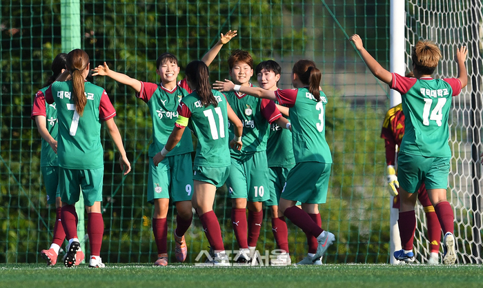 대전대덕대 김수연(가운데)이 23일 경남 합천에서 열린 ‘2025 스포츠케이션 명품도시 합천에서 펼쳐지는 제33회 여왕기 전국여자축구대회’ 대학부 울산과학대와의 경기에서 헤더로 동점골을 넣고 동료들과 함께 기뻐하고 있다. 2025. 6. 23.