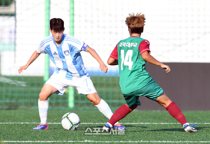 울산과학대 김수아(왼쪽)가 23일 경남 합천에서 열린 ‘2025 스포츠케이션 명품도시 합천에서 펼쳐지는 제33회 여왕기 전국여자축구대회’ 대학부 대전대덕대와 경기에서 대전대덕대 이은솔을 상대로 돌파를 시도하고 있다. 2025. 6. 23.