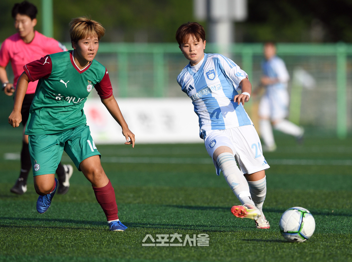울산과학대 이하은(오른쪽)이 23일 경남 합천에서 열린 ‘2025 스포츠케이션 명품도시 합천에서 펼쳐지는 제33회 여왕기 전국여자축구대회’ 대학부 대전대덕대와 경기에서 대전대덕대 이은솔의 수비를 피해 동료에게 패스를 하고 있다. 2025. 6. 23.