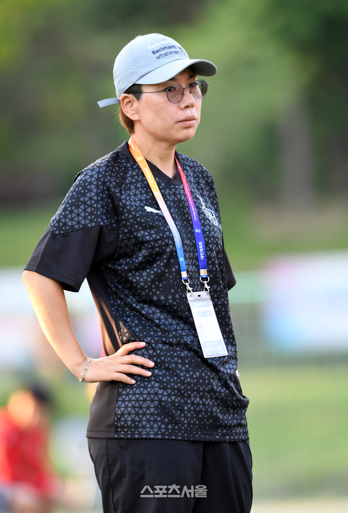 대전대덕대 고문희 감독이 23일 경남 합천에서 열린 ‘2025 스포츠케이션 명품도시 합천에서 펼쳐지는 제33회 여왕기 전국여자축구대회’ 대학부 울산과학대와 경기에서 선수들의 플레이를 지켜보고 있다. 2025. 6. 23.