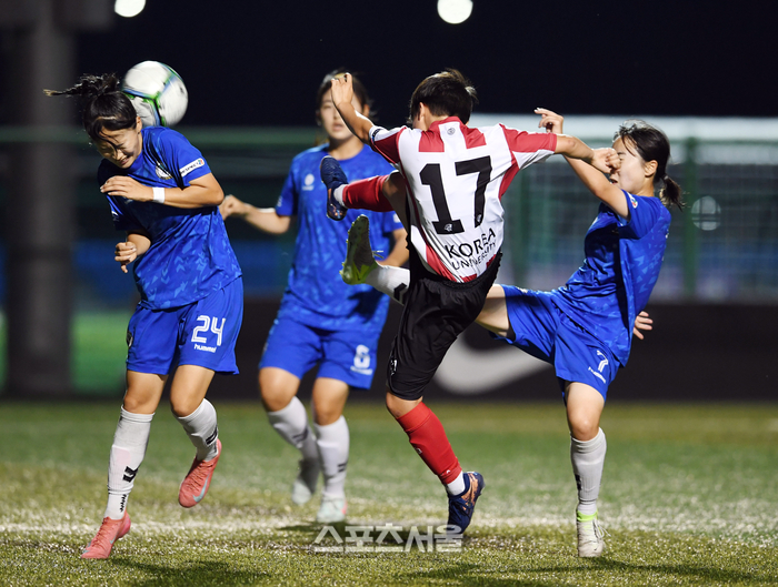세종고려대 양은서(가운데)가 23일 경남 합천에서 열린 ‘2025 스포츠케이션 명품도시 합천에서 펼쳐지는 제33회 여왕기 전국여자축구대회’ 대학부 강원도립대와 경기에서 골을 넣고 있다. 2025. 6. 23.