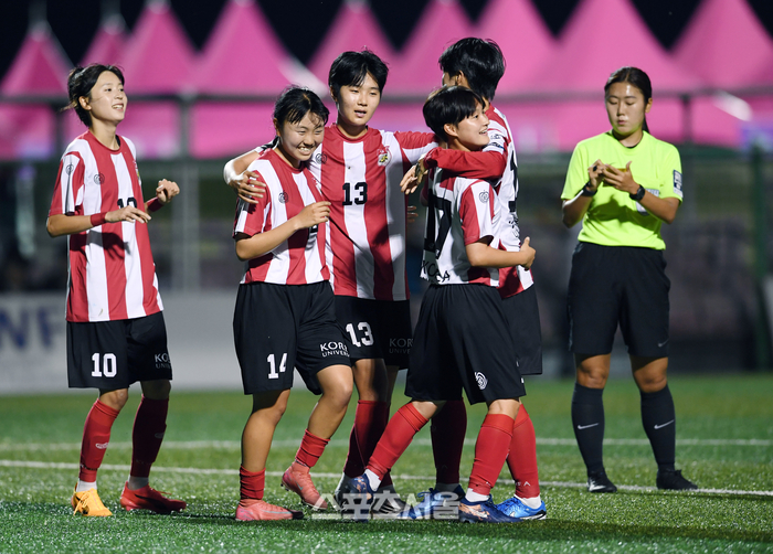 세종고려대 양은서(맨 오른쪽)가 23일 경남 합천에서 열린 ‘2025 스포츠케이션 명품도시 합천에서 펼쳐지는 제33회 여왕기 전국여자축구대회’ 대학부 강원도립대와 경기에서 골을 넣은 뒤 동료들과 함께 기뻐하고 있다. 2025. 6. 23.