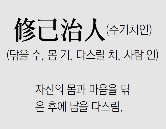● 유래: 논어(論語) 헌문(憲問)편에 나오는 이야기입니다. 자로(子路)가 군자(君子)에 대해 묻자 공자는 “군자는 자신을 닦기를 경(敬)으로써 한다(修己以敬)”고 답합니다. 자로는 “그것뿐입니까?”라고 되묻습니다. 이에 공자는 “자신을 닦음으로써 남을 편안하게 한다(修己以安人)”고 설명합니다. 다시 자로가 반복해 묻습니다. “그것뿐입니까?” 이에 공자는 “자기를 닦음으로써 백성을 편안하게 해야 하니(修己以安百姓), 자기를 닦음으로써 백성을 편안하게 하는 것은 요순(堯舜) 임금께서도 오히려 부족하게 여기셨다”라고 답합니다. 이 이야기에서 修己治人(수기치인)의 유래를 찾을 수 있습니다. 수기치인의 구조를 가장 명확하게 제시하고 있는 것은 대학(大學)의 팔조목(八條目)입니다. 수기와 치인의 방법을 세분화해 격물(格物), 치지(致知), 성의(誠意), 정심(正心), 수신(修身), 제가(齊家), 치국(治國), 평천하(平天下)로 나눠 설명하고 있습니다.
