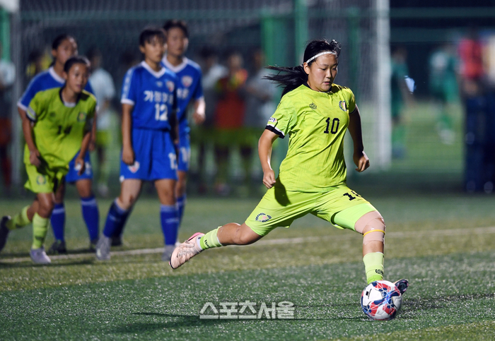 전북체육중 최윤서가 23일 경남 합천에서 열린 ‘2025 스포츠케이션 명품도시 합천에서 펼쳐지는 제33회 여왕기 전국여자축구대회’ 중등부 인천 가정여중과의 경기에서 페널티킥 골을 넣고 있다. 2025. 6. 23.