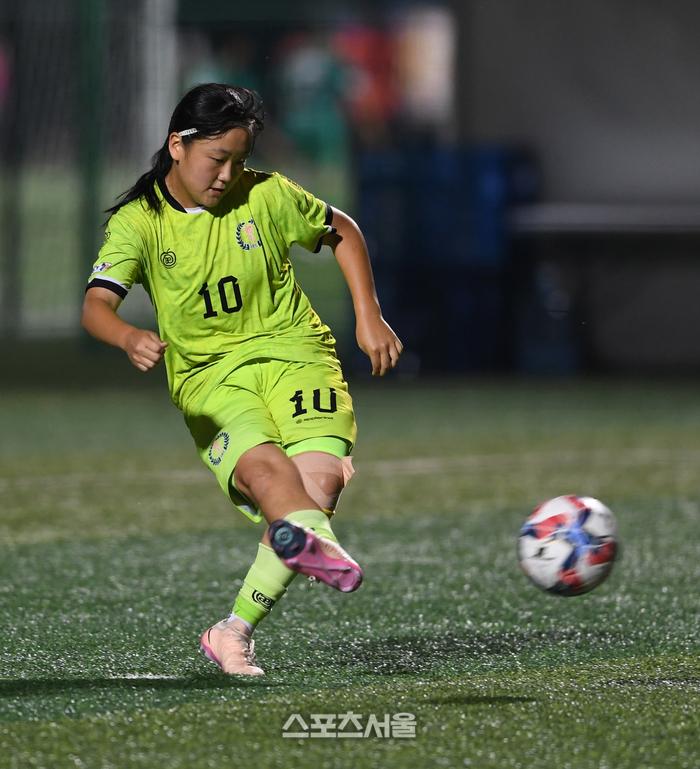 전북체육중 최윤서가 23일 경남 합천에서 열린 ‘2025 스포츠케이션 명품도시 합천에서 펼쳐지는 제33회 여왕기 전국여자축구대회’ 중등부 인천 가정여중과의 경기에서 페널티킥 골을 넣고 있다. 2025. 6. 23.