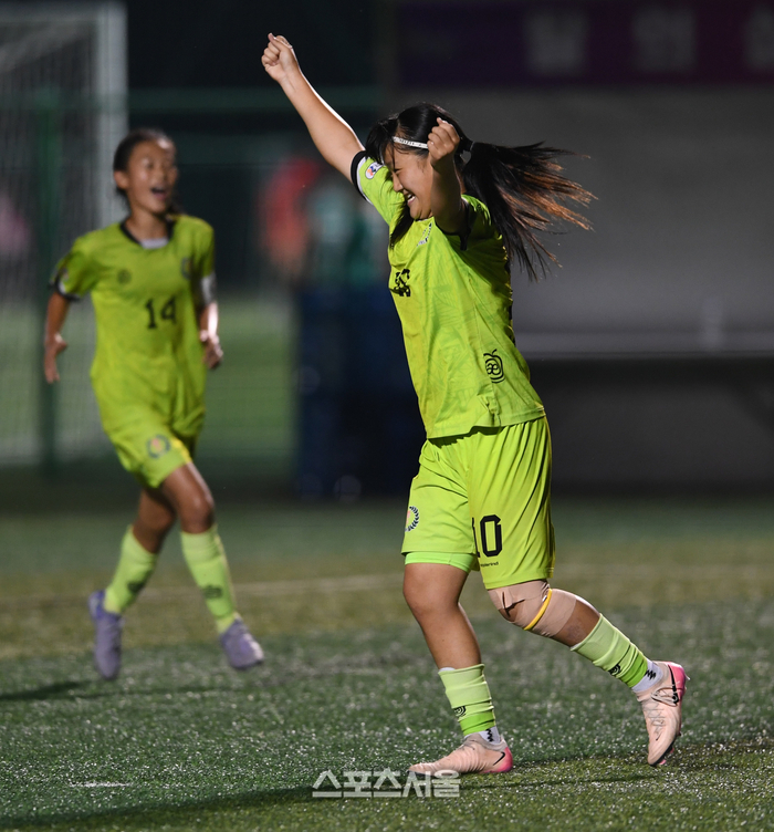 전북체육중 최윤서가 23일 경남 합천에서 열린 ‘2025 스포츠케이션 명품도시 합천에서 펼쳐지는 제33회 여왕기 전국여자축구대회’ 중등부 인천 가정여중과의 경기에서 페널티킥 골을 넣고 기뻐하고 있다. 2025. 6. 23.
