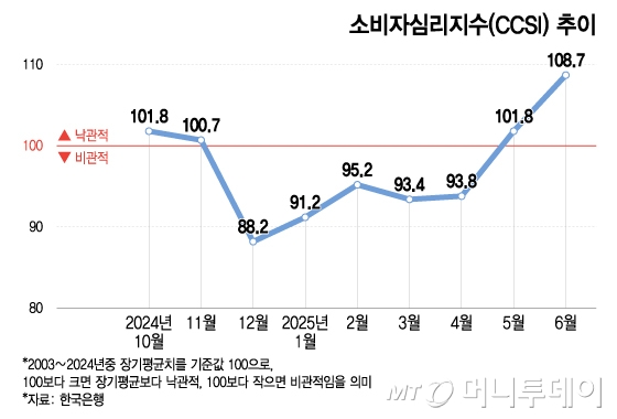 한국은행이 24일 발표한 '6월 소비자동향조사'에 따르면 이달 중 소비자심리지수(CCSI)는108.7로 전월 대비 6.9포인트(p) 올랐다. 2021년 6월(111.1) 이후 가장 높다.