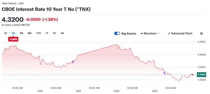 미 국채 10년물 수익률 차트, 자료=야후 파이낸스, 2025.06.24 koinwon@newspim.com |