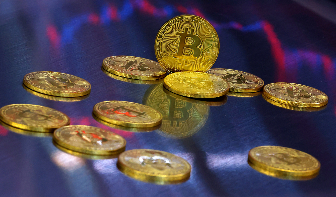 사진은 비트코인 모형이 놓인 바닥에 코인 시세 그래프가 비치는 모습. 연합뉴스 |