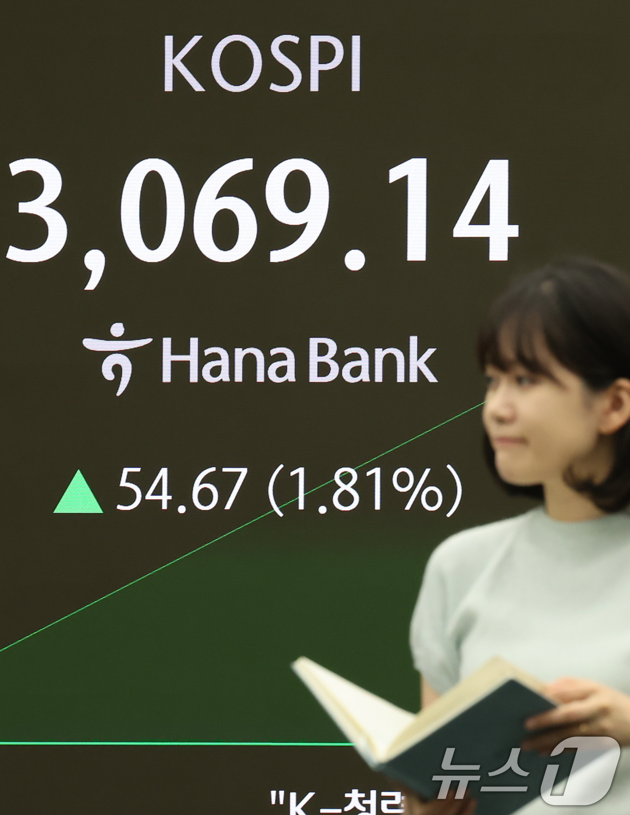 (서울=뉴스1) 장수영 기자 = 24일 오전 서울 중구 하나은행 딜링룸 전광판에 코스피 지수가 표시되고 있다. 이날 도널드 트럼프 미국 대통령이 이스라엘과 이란이 휴전에 합의했다고 밝히면서 코스피는 46.67p(1.55%) 오른 3061.14 출발, 2% 안팍의 상승을 보이고 있다. 2025.6.24/뉴스1