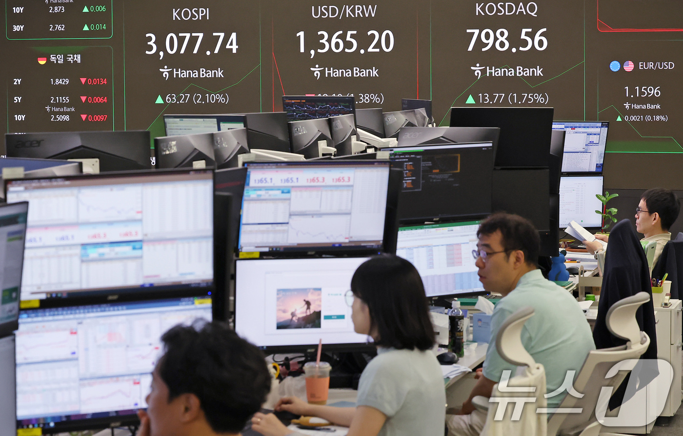 (서울=뉴스1) 장수영 기자 = 24일 오전 서울 중구 하나은행 딜링룸 전광판에 코스피, 코스닥 지수와 원달러 환율이 표시되고 있다. 이날 도널드 트럼프 미국 대통령이 이스라엘과 이란이 휴전에 합의했다고 밝히면서 코스피는 46.67p(1.55%) 오른 3061.14 출발, 2% 안팍의 상승을 보이고 있다. 2025.6.24/뉴스1