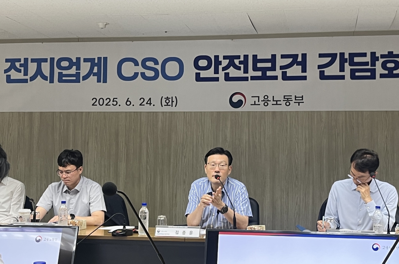 고용노동부는 24일 김종윤 산업안전보건본부장 주재로 전지업계 CSO(Chief Safety Officer) 안전보건 간담회를 개최했다고 밝혔다. 이날 간담회에는 1차 전지 제조사인 비츠로셀, SM벡셀, 제노에너지와 2차 전지 제조사인 LG에너지솔루션, 삼성SDI, SK온이 참석했다.