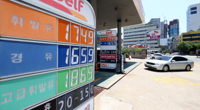 22일 서울 시내의 한 주유소 앞 유가정보판에 휘발유와 경유 등의 가격이 표시돼 있다. 지난주 국내 주유소 휘발유·경유의 주간 평균 가격은 6주 만에 상승 전환됐으며, 국제 유가 역시 이란·이스라엘 간 무력 충돌에 따른 중동 지정학적 리스크 상승 등이 반영돼 올랐다. 연합뉴스 |