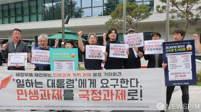[서울=뉴스핌] 양윤모 기자 = 참여연대·한국중소상인자영업자총연합회·전국가맹점주협의회 등이 24일 오전 서울 종로구 창성동 국정기획위원회 앞에서 기자회견을 열고 중소상인·자영업자 권리 보장 등의 민생 경제 정책을 국정과제로 추진해달라고 촉구했다. 2025.06.24 yym58@newspim.com