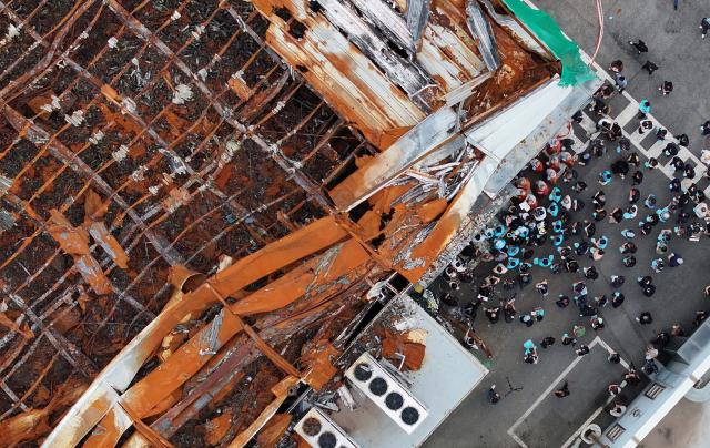 24일 경기도 화성시 아리셀 화재 사고 현장에서 열린 '아리셀 참사 1주기 현장 추모 위령제'에서 유가족과 참석자들이 참서 현장에 헌화하고 있다. [사진=연합뉴스] |
