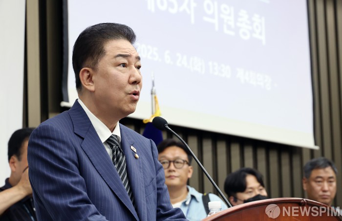 [서울=뉴스핌] 정일구 기자 = 김병기 더불어민주당 대표 직무대행 겸 원내대표가 24일 오후 서울 여의도 국회에서 열린 의원총회에서 모두발언을 하고 있다. 2025.06.24 mironj19@newspim.com