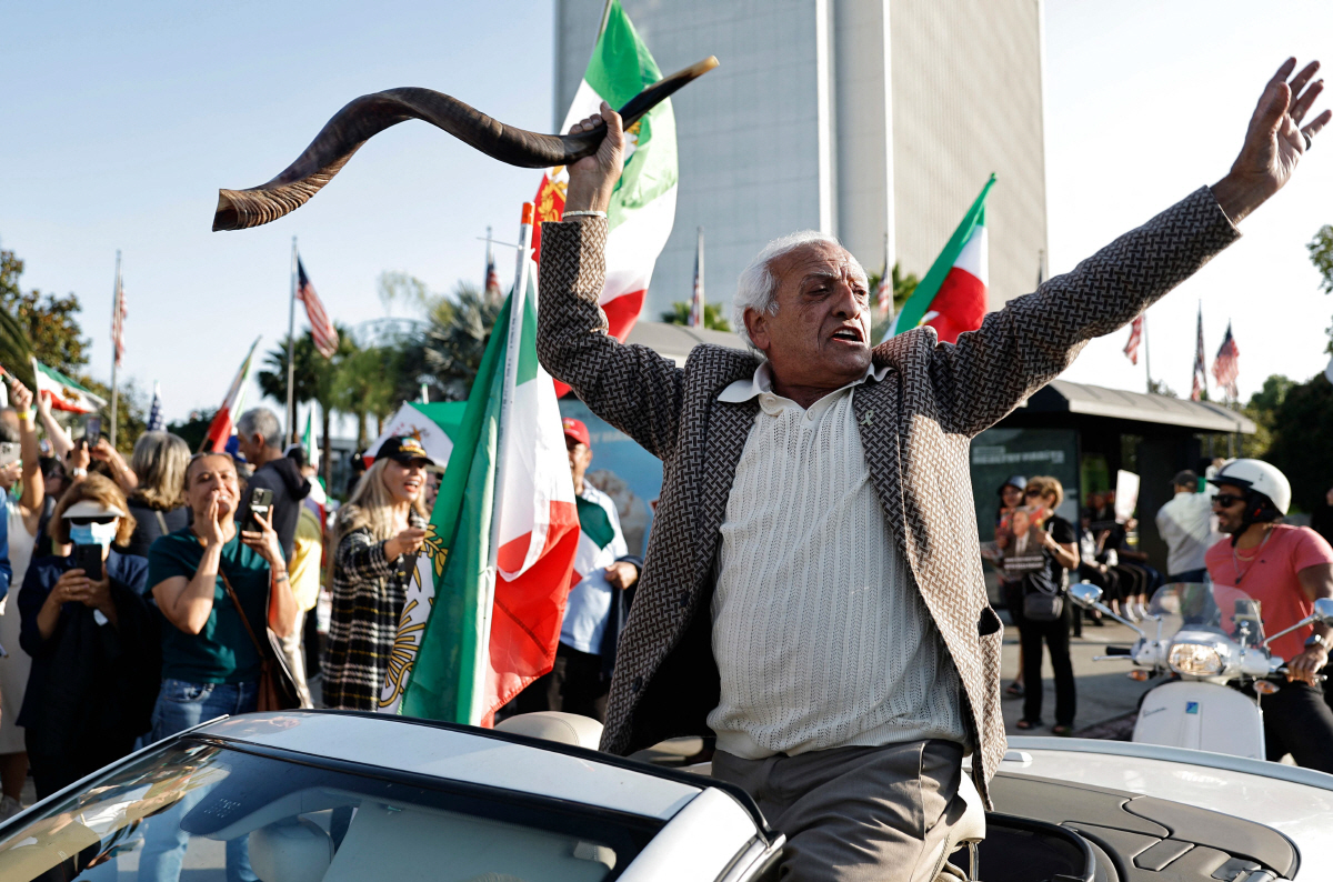 미국 로스앤젤레스(LA)에서 23일(현지시간) 이란 정권 교체 지지자들이 시위하고 있다. 로스앤젤레스/AFP연합뉴스 |