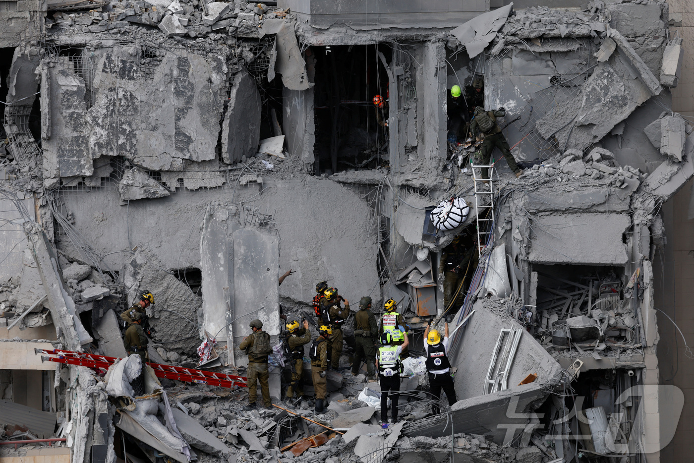 (베르셰바 로이터=뉴스1) 송송이 기자 = 이스라엘-이란 분쟁 가운데 이란의 미사일 공격 이후, 이스라엘 베르셰바에서 구조대원이 피해를 입은 주거 지역 현장에서 작업하고 있다. 2025.6.24 ⓒ 로이터=뉴스1